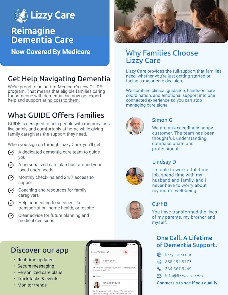 Lizzy Care provides the full support that families need, whether you’re just getting started or facing a major care decision. We combine clinical guidance, hands-on care coordination, and emotional support into one connected experience so you can stop managing care alone.